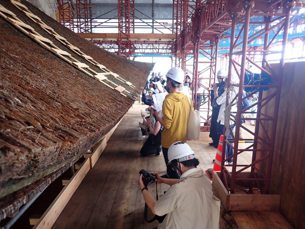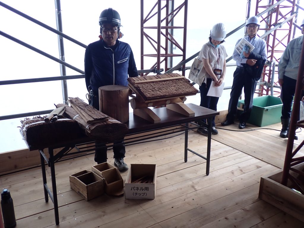 足場内の階段で5層(最上階)の屋根位置まで上がり、5層の屋根の前で工事の現場責任者の方から工事内容および檜皮葺屋根について解説頂き、質疑応答を行いました。