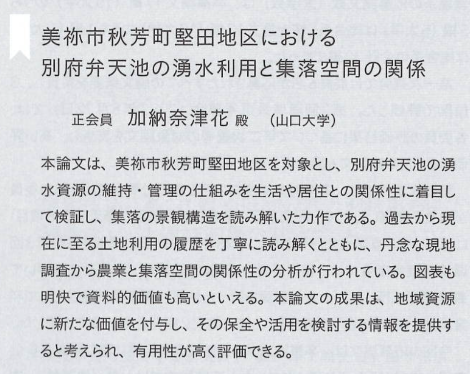 卒業論文「美祢市秋芳町堅田地区における別府弁天池の湧水利用と集落空間の関係」