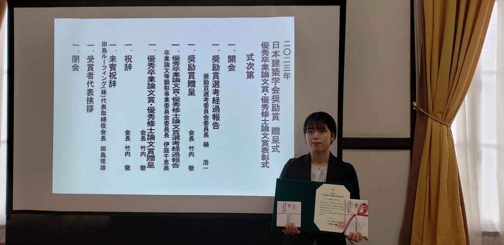 日本建築学会の優秀卒業論文賞に選定され、9/12〜15に京都大学で開催された日本建築学会大会にて授賞式が行われました。
