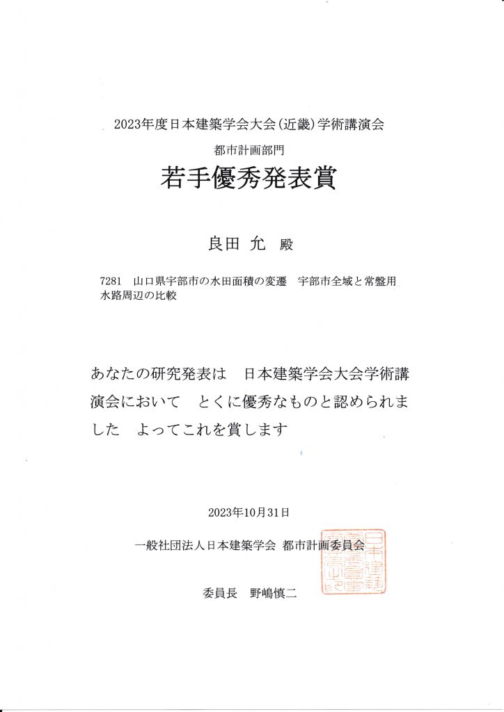 大学院創成科学研究科建設環境系専攻 博士前期課程2年の原さくらさんと、同1年の良田允さん(建築・都市デザイン研究室所属)が、2023年度日本建築学会大会において若手優秀発表賞を受賞しました