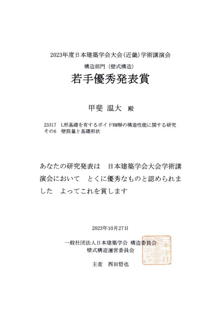 大学院創成科学研究科建設環境系専攻 博士前期課程2年の甲斐温大さん(建築構造学研究室所属)が、2023年9月京都大学で開催された2023年度日本建築学会大会において、構造部門(壁式構造)で若手優秀発表賞を受賞しました。