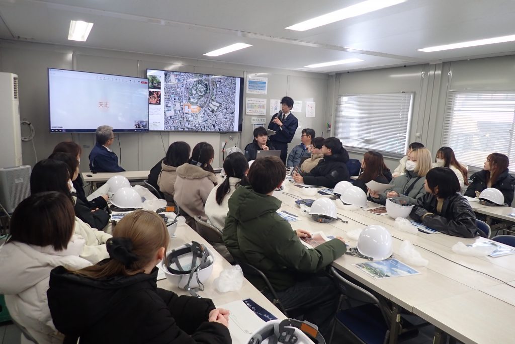 現在、建て替えが進行中の山口市新本庁舎の建設現場において、本学科の学生を対象とした第4回見学会が開催され、学部1年生を中心に20名が参加しました。新本庁舎は完成間近で、ゴールデンウィーク明けに開庁予定です。現場では内装工事や電気工事の最終段階が進められており、各種検査も実施されていました。見学会では、まず現場事務所で概要説明を受けました。今回は1年生が中心であることから、建物の設計や施工の概要に加え、設計や施工管理の仕事についても説明がありました。その後、建物内に入り、議場(6階)、消防本部(5階)、市長室(4階)、執務室(1~3階)を順に見学しました。議場に施されたデザインや機能面での工夫、山口市の伝統工芸である大内塗や徳地和紙が要所要所に使用されている点、中央階段のデザインのポイントなどについて解説を受けました。見学後、再び現場事務所に戻り質疑応答を行い、最後に集合写真を撮影して見学会は終了しました。2年間の建設期間中に全4回実施された見学会も、今回で最後となりました。お忙しい中、見学会の準備をしてくださった現場の皆様、設計者の皆様、山口市役所の皆様に、改めて感謝申し上げます。なお、工事の進捗状況は特設サイト(下記URL参照)でご覧いただけます。ぜひご確認ください。https://yamaguchi-shinhonchosha.jp/