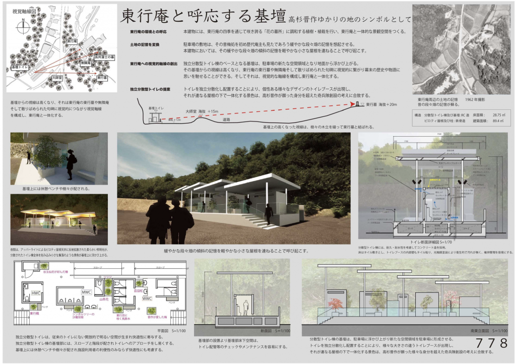 東行庵公衆トイレデザインコンペ(下関市)にて、感性デザイン工学科3年生(R4)の髙橋仁志さん、岡田月魚さん、橙良汰さんの作品「東行庵と呼応する基壇」が、の入選作品に選ばれました。